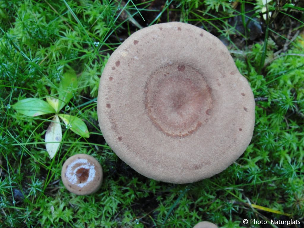 Hatten är sammetslen, först svagt konvex men blir med tiden tydligt trattformad. Den är svagt zonad i olika beige till ljusgrå nyanser, ljusare mot kanten och mörknar in mot mitten. Hatten kan bli relativt stor och är ofta något oregelbunden i kanten. Skivorna är fästa vid stammen och inte sällan kluvna nära stammen. De är vitaktiga som unga men blir senare smutsigt gulaktiga allteftersom sporerna mognar. Stammen är 3–10 cm lång och upp till cirka 2 cm tjock, slät eller mycket fint sammetsluden hos unga exemplar. Färgen varierar men är ofta orange till orangebrun. Formen är mer eller mindre cylindrisk, ibland svagt avsmalnande mot basen. Köttet är blekt rosa till svagt brunaktigt och ganska sprött. Vid snitt utsöndras en vattenklar, färglös vätska (mjölksaft), vilket är karakteristiskt för arten.