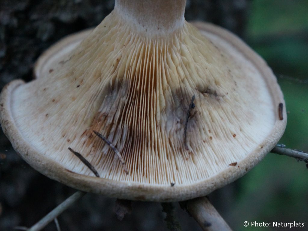 Hatten är 4–12 cm i diameter, utbredd, plan till trattformad och har ofta en svag puckel i mitten. Färgen är brun till gulbrun och hattens yta är slät och klibbig i vått väder. Hattkanten är länge inrullad hos yngre exemplar. Skivorna är tämligen täta, vidfästa till svagt nedlöpande och gulvita till ljust gulbruna. Ett viktigt kännetecken är att skivorna snabbt blir brunfläckiga vid tumning eller tryck. Foten är 3–6 cm hög, gulvit till gulbrun och avsmalnande mot basen. Den är oftast något ljusare än hatten och kan vara svagt excentriskt fäst.