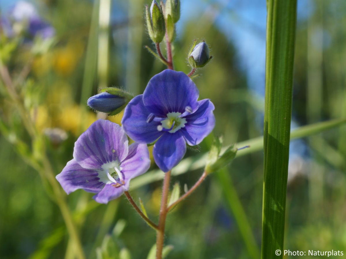Bladen sitter motsatta, är äggrunda med grov sågtandning och växten har ofta en tydlig hårkant längs stjälken. Den blommar från vår till sommar med klara, himmelsblå blommor med vit mitt och mörkare blå ådring. Blommorna är relativt små men mycket iögonfallande och sitter på korta skaft i bladvecken.