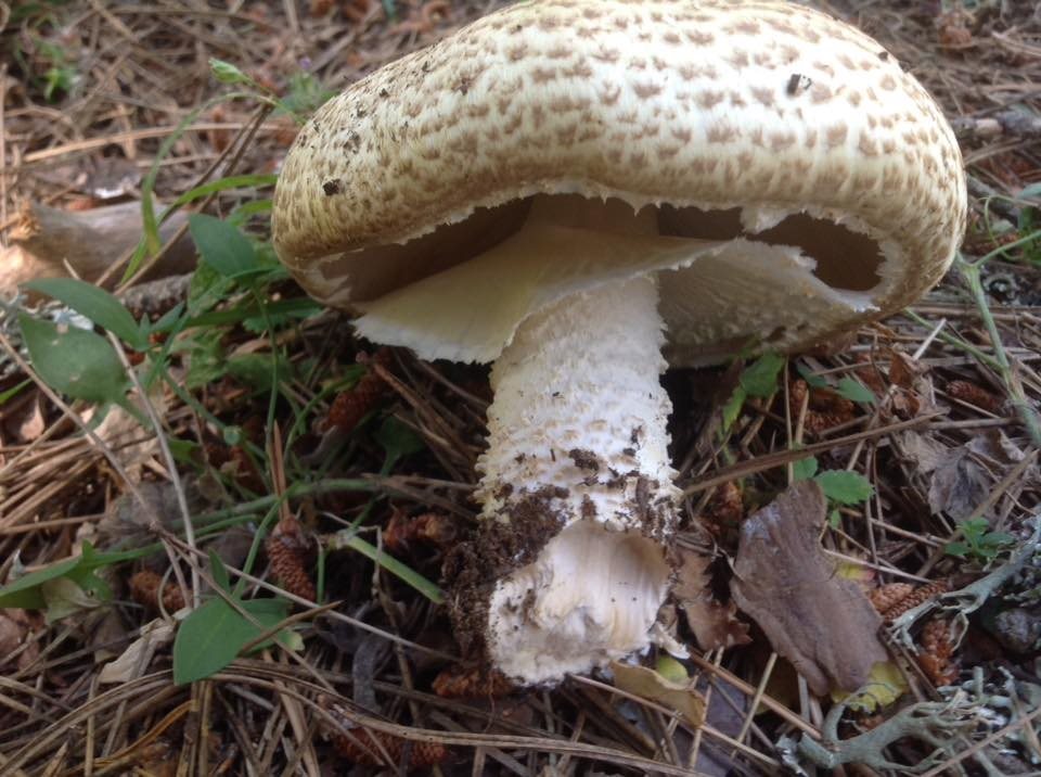 Hatten är 5–30 cm i diameter, ockragul till halmgul och täckt av tillplattade gulbruna fjäll som ger den ett grovt, fjälligt utseende. Den är först halvklotformad till konvex, senare mer utbredd. Köttet är tjockt och vitt, men gulnar med tiden eller vid hantering, särskilt i hatt och övre delen av foten. Doften är tydligt mandel- eller anisaktig. Skivorna är täta, först gråvita, senare gräddfärgade och till slut mörkt bruna i takt med att sporerna mognar. De är fria från foten. Foten är kraftig, 10–20 cm lång och 2–4 cm i diameter, ofta något klubbformad. Den är vit till svagt gulaktig och har en stor, tunn ring som kan vara lite hängande.