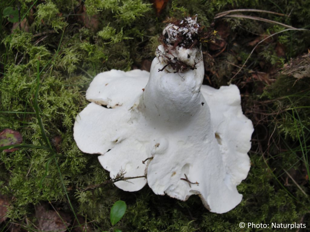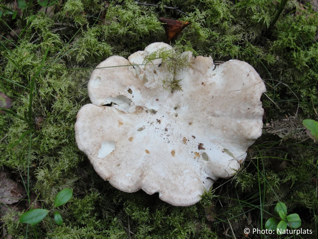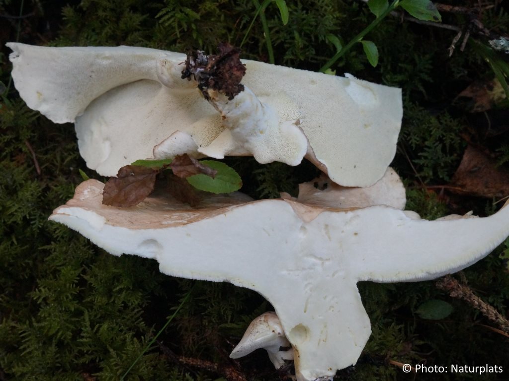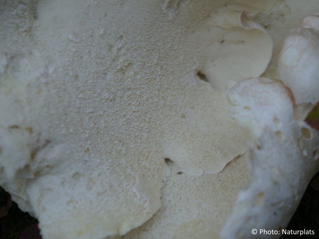Hatten är 10–20 cm bred, oregelbunden i formen och ofta något knölig. Färgen är gråvit till vit och hatten kan få ljusgula missfärgningar med åldern eller vid tryck. Porerna på hattens undersida är först vita men blir senare vitgula. Porlagret är tätt och löper ned en bit på foten. Foten är vit, kort (cirka 3–5 cm hög) och relativt tjock. Den kan ibland vara svagt sidoställd i förhållande till hatten.