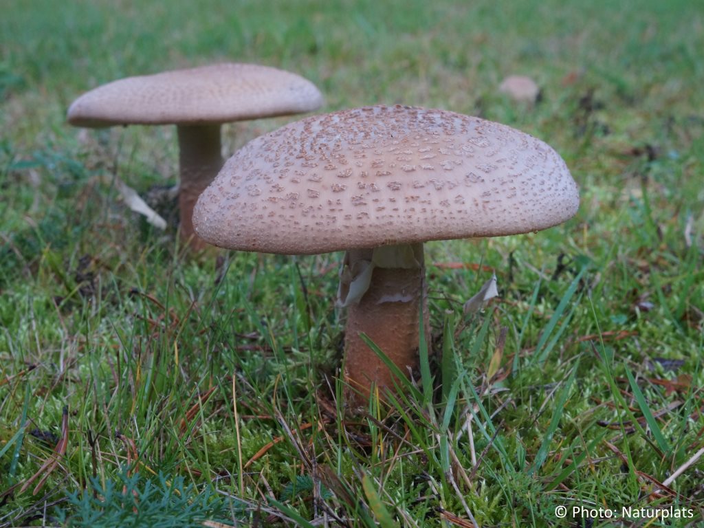 Hatten är 8–15 cm bred, först nästan sfärisk, senare konvex och till slut mer utbredd. Färgen är köttröd till rödbrun och hattytan är försedd med smutsvita till gråaktiga hylleplättar (rester av hyllet). Köttet är vitt men färgas rosa till rödaktigt i snittytorna eller där det skadas. Skivorna är vita från början, men blir med tiden fläckigt brunrosa. De är täta och fria från stammen. Sporerna är vita i sporfärg. Stammen är vitgrå, ofta med svaga horisontella linjer ovanför ringen. Den är kraftig och har en uppsvälld bas. Vid fotbasen finns rester av hyllet, ibland som svaga bälten eller fläckar.