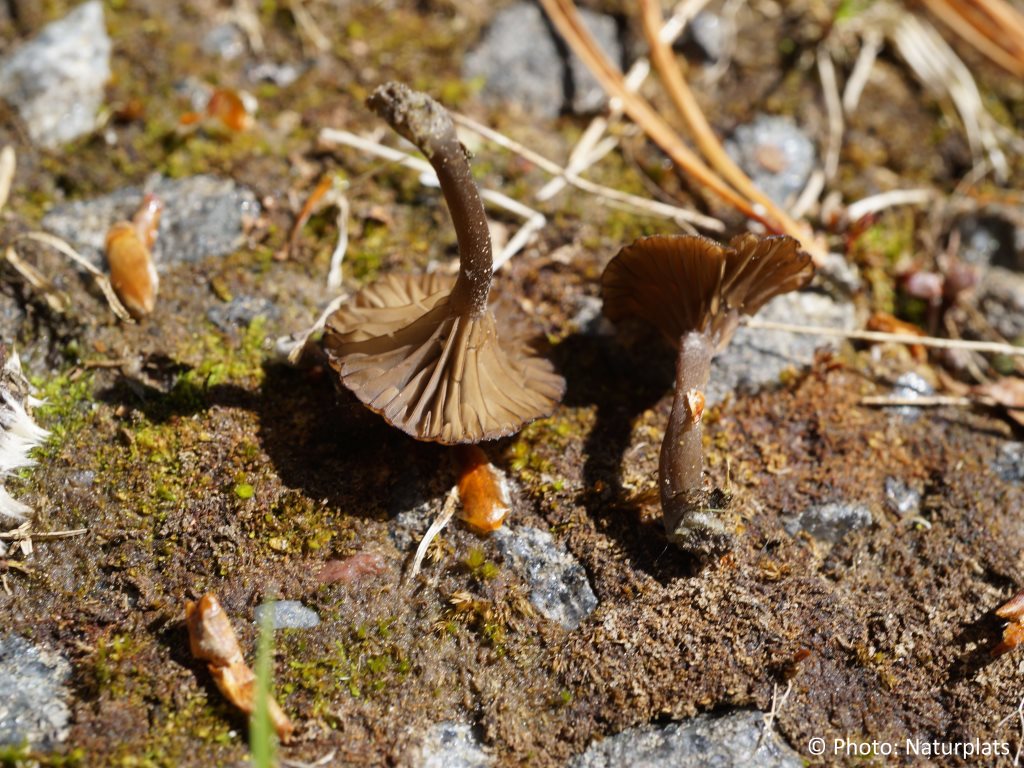 Hatten är vanligen omkring 1 cm i diameter. De minsta exemplaren kan vara knappt 0,5 cm, och även de största blir sällan mer än knappt 2 cm. Hattytan är gråbrun till brun, ofta med svaga radiella ränder och ett något nedsänkt nav i mitten. Skivorna är få, glest stående och ljusa, med gråaktig eller brun ton. De kan vara något oregelbundna och delvis nedlöpande. Foten är tunn, slät, gråbrun och cirka 1–2,5 cm lång, ofta något böjd och fin.