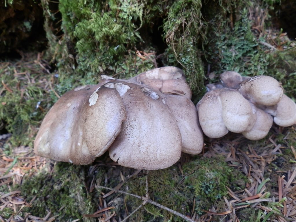 Hatten är 5–17 cm bred och kan vara violettgrå, gulaktig eller purpurbrunaktig, oftast med ljusare kant. Ovansidan är torr, först filtluden och blir senare mer kal med glest uppspruckna fjäll. Till skillnad från många andra taggsvampar har den inte inväxta förnarester i hattytan, och flera hattar kan ibland växa samman. Taggarna på undersidan är 6–7 mm långa, först vita men blir efterhand gråaktiga. De sitter tätt och är tydligt nedlöpande på foten. Sporpulvret är vitt. Fruktköttet är inte zonerat i genomskärning. Det är ganska mjukt, vitaktigt till svagt lilagrått i hatten och mer purpuraktigt i foten. Foten är ofta förgrenad och avsmalnande mot basen, något filtartad och har samma färg som hatten eller är något mörkare brun, vanligen med en svagt violett ton. Svampen har en tydligt kryddig doft som är ett viktigt kännetecken.