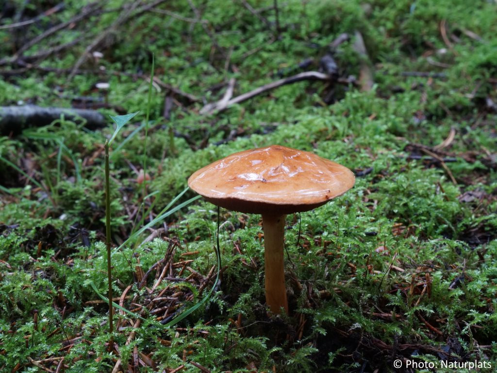 Hatten är 3–8 cm i diameter, blekt kanelbrun till brun och torr med svag glans. Den är först konvex men blir med tiden mer utbredd och kan ibland bli svagt nedtryckt i mitten. Porerna är relativt grova, kantiga och rostbruna till rödbruna, ofta mörkare med åldern. Stammen är 4–9,5 cm lång och cirka 0,6–1,2 cm tjock, ungefär jämntjock eller något tjockare mot basen. Färgen liknar hattens, ibland något ljusare, och ytan är relativt slät. Köttet är gult, ibland med svaga rödaktiga inslag, och har en tydligt skarp, brännande smak men ingen särskilt framträdande lukt. Sporavtrycket är brunt till kanelfärgat.