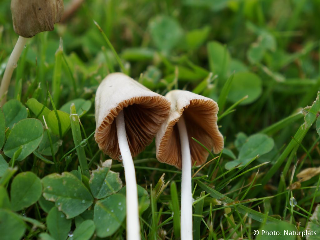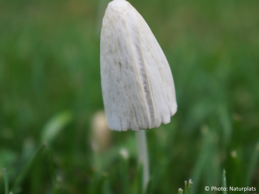 Hatten är 1–3 cm bred, först tydligt konisk, senare mer klock- till konformad med något upplyft kant. Färgen är vitaktig till gräddfärgad, ibland med en svagt mörkare mittzon. Hatten är mycket skör och tunnköttig. Skivorna är fästa vid stammen eller nästan fria, först bleka men mörknar snart till kanelbruna eller rosabruna allteftersom sporerna mognar. De är relativt täta. Stammen är 3–11 cm lång, bara några få millimeter tjock, extremt spröd och ihålig. Den är mer eller mindre jämntjock, vitaktig och slät eller med fina, knappast synliga hår på den övre delen.