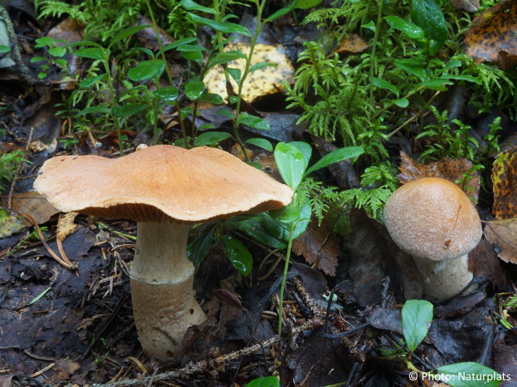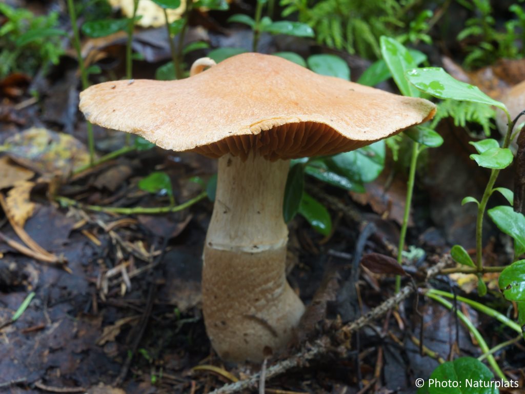 Hatten är 3–8 cm i diameter, välvd med tjockt fruktkött och varmt kanelfärgad. Ytan är torr till svagt fibrig och kan vara något mörkare i mitten. Skivorna är ljust kanelfärgade, täta och något nedåtböjda mot mitten, vilket är ett av artens tydligaste kännetecken. Stammen är 6–10 cm lång och 1–2 cm bred, med tydligt svullen bas. Färgen är blekt kanelfärgad med gräddfärgade fibrer och vita slöjrester som ofta bildar ett markant, tjockt bälte ungefär på mitten av stammen.
