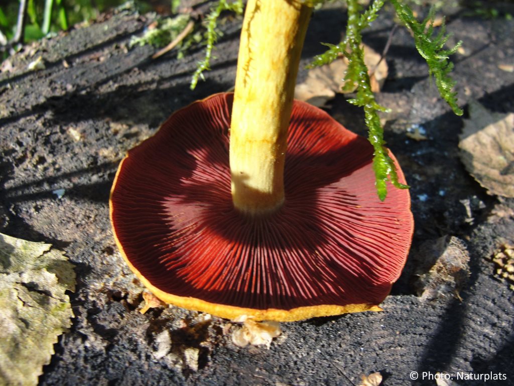 Hatten är 1,5–7 cm i diameter, först konvex, senare mer utbredd – från svagt konvex till nästan plan eller något klockformad, ibland med en skarpare liten puckel i mitten. Färgen är gulbrun till kanelbrun, ofta något mörkare i mitten än mot kanten. Hattytan är slät till svagt fibrig. Skivorna är fästa vid stammen och som unga slående blodröda. Med åldern blir de kanelbruna till rostbruna allteftersom de brunsporriga sporerna mognar. Hos unga fruktkroppar är skivorna delvis täckta av en gulaktig, spindelvävslik slöja. Stammen är 2,5–10 cm lång och upp till cirka 1,5 cm tjock, mer eller mindre jämntjock. Den är oftast blekt gulaktig, men mörknar eller får mer rödaktiga toner mot basen. Ofta syns en rostbrun ringzon där slöjan suttit. Köttet är vitaktigt till blekt gulaktigt och har en lukt som påminner om rädisor.