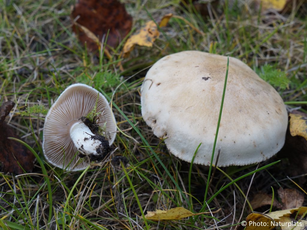 Hatten är 2–10 cm bred, först konvex, senare mer utbredd – från svagt konvex till nästan klockformad eller platt. Ytan är något slemmig när svampen är färsk, annars slät. Färgen är vitaktig till smutsigt vit eller blekt solbränd, ofta något mörkare i mitten. Hattkanten är inåtböjd hos unga exemplar. Skivorna är täta, fästa vid foten ofta med ett svagt hack. De är bleka som unga men blir efter hand mer brunaktiga när sporerna mognar. Stammen är 4–12 cm lång och 0,5–1,5 cm tjock, mer eller mindre jämntjock med något svullen bas. Ibland kan fotbasen ha små vita fjäll. Köttet är vitaktigt och ganska tjockt.