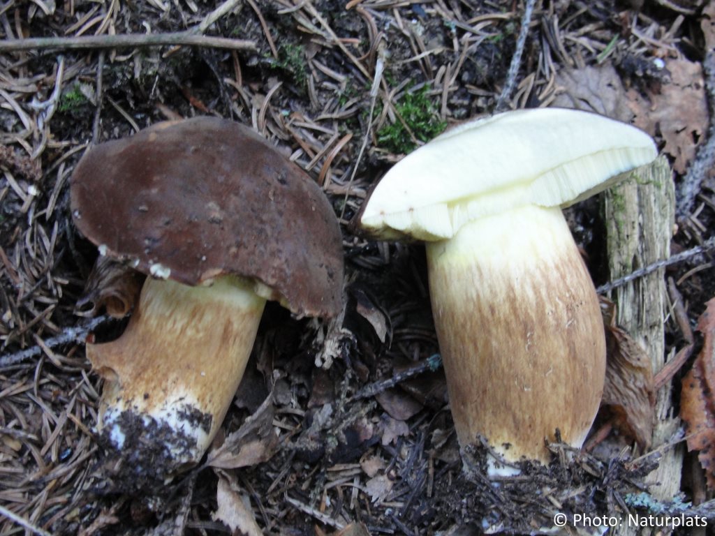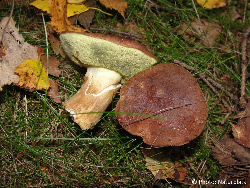 Hatten är 5–15 cm bred, rödbrun till brun, oftast mörkt kastanjebrun. Den är först välvd och blir med tiden mer utbredd. Hattköttet är fast och blekt och kan bli svagt blåaktigt där det skärs eller bryts. Hatthuden är torr i torr väderlek men blir klibbig när den är fuktig. Porerna är ljusgula som unga, och blir med tiden mer gröngula till olivfärgade. Vid tumning eller tryck ändrar porerna snabbt färg till gråaktigt, blåaktigt eller grönblått. Stammen är 5–15 cm lång och 2–3 cm tjock, mer eller mindre jämntjock men kan vara något böjd, särskilt nära basen. Den saknar ring och är täckt av fina, bomullsliknande trådar som ger den ett diskret strimmigt utseende. Köttet är vitaktigt till ljust gulaktigt, fast hos unga exemplar och något mjukare med åldern.