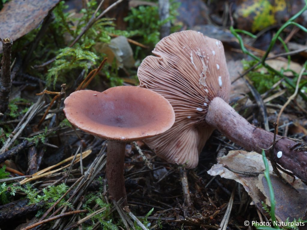 Hatten är mörkt rödbrun och kan hos äldre exemplar dra åt brunlila. Den är relativt tunnköttig och blir ofta något nedtryckt i mitten med åldern. Hattytan är torr och kan vara svagt zonerad. Skivorna är täta, först ljust brunaktiga men blir med tiden ljusare och kan se vitpudrade ut av sporerna. Mjölksaften är vit, ganska sparsam och mild i smaken. Svampen har en svag kryddig doft som kan påminna om curry eller bouillon. Foten har samma färg som hatten, mörkt rödbrun till brunlila, är 2–5 cm hög och relativt slank. Den kan vara något matt och ibland svagt avsmalnande mot basen.