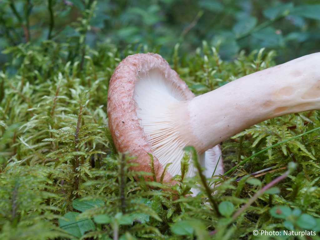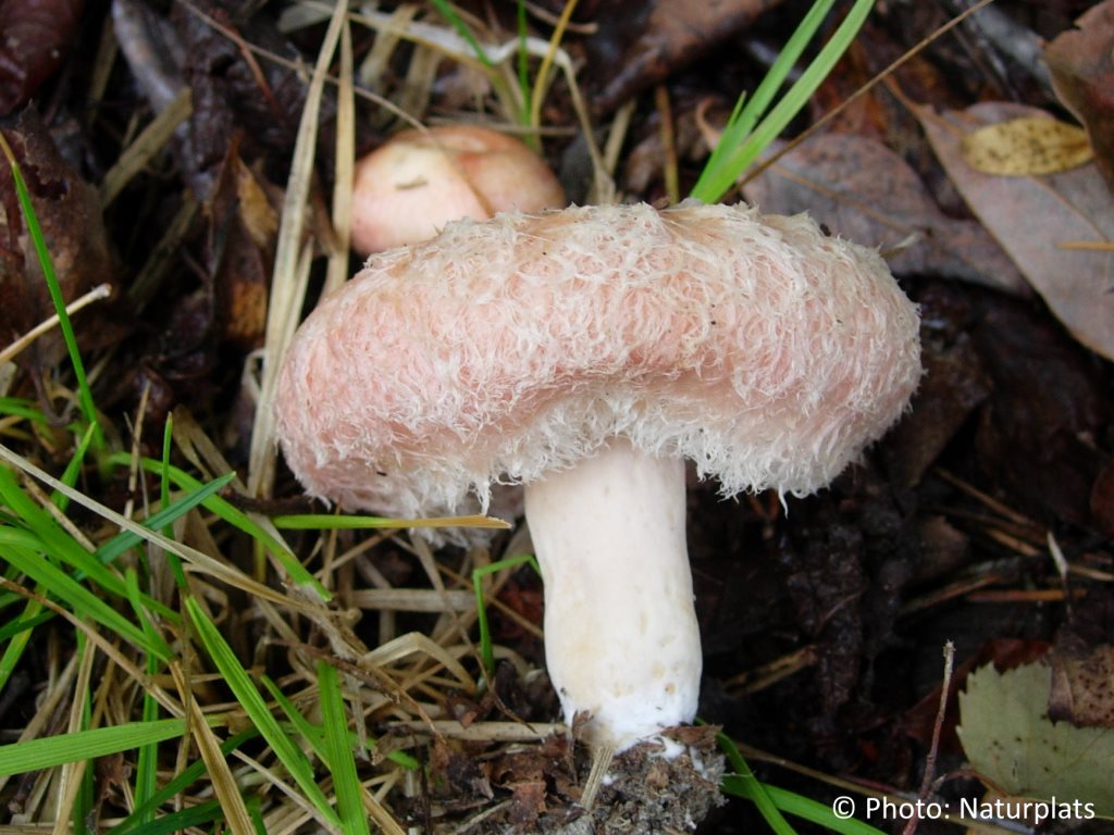 Hatten är 5–15 cm bred, rosa till gulröd och tydligt koncentriskt zonerad i mörkare brunröda ringar. Hos unga exemplar är hattkanten starkt inrullad och radiärt trådig, vilket ger den karakteristiskt ”skäggiga” kanten som gett arten dess namn. Med åldern blir hatten mer utbredd och ofta svagt nedtryckt i mitten. Skivorna är täta, fästa vid stammen och har ungefär samma färgton som stammen – blekt rosa till ljusgul. Vid skada kan de få svaga mörkare fläckar. Stammen är 4–8 cm lång och 1–2 cm tjock, cylindrisk, ihålig och blekare än hatten, ofta svagt rosa eller ljusgul. Den saknar ring, i likhet med andra arter i släktet Lactarius.