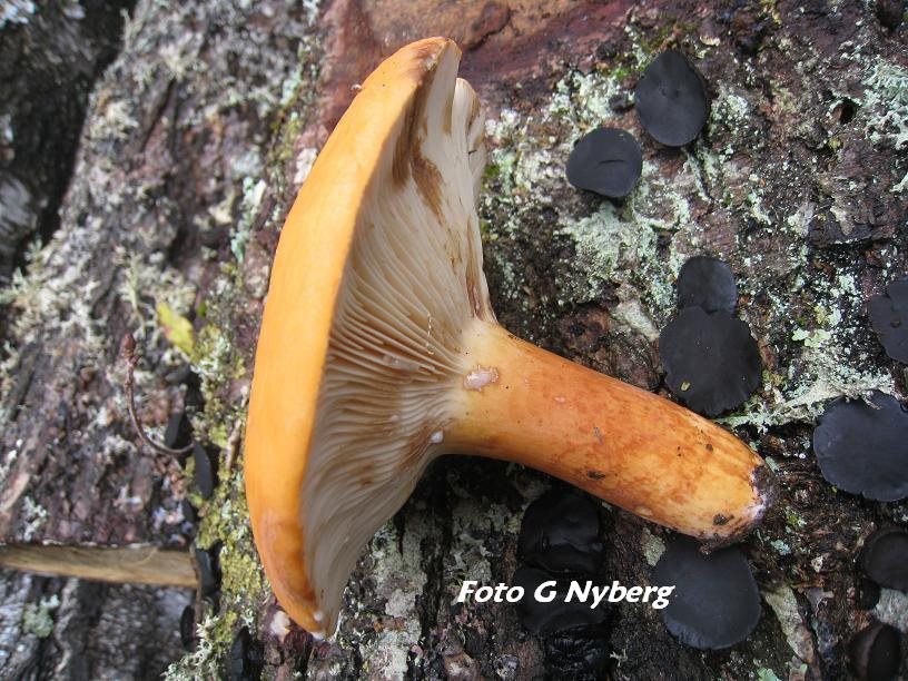 Hatten är som ung välvd och fint sammetsluden, senare mer utbredd och svagt nedtryckt i mitten. Färgen är varm orangebrun till rödbrun, ibland något ljusare mot kanten. Skivorna är vidväxta till svagt nedlöpande och gräddgula. Vid tumning eller skada blir de snabbt brunfläckiga, särskilt där mjölksaften runnit. Foten är 5–10 cm lång och 0,5–2,5 cm tjock, oftast något avsmalnande mot basen. Den är färgad som hatten eller något ljusare och är fast i konsistensen hos yngre exemplar. Köttet och mjölksaften är ljust, fast och sprött. Svampen avsöndrar rikligt med vit mjölksaft som snart brunfärgas i kontakt med luft och ger bruna fläckar på kött och skivor. Smaken är mild till svagt kärv, och doften är kraftig och påminner om skaldjur.