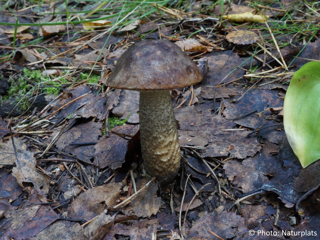 Hatten är 4–20 cm bred, först halvkupad som ett halvklot och blir senare mer utbredd och plattare. Färgen är matt gulbrun till gråbrun, ibland något fläckig. Ytan är torr eller svagt sammetsartad i torr väderlek och kan bli något klibbig vid fukt. Porerna är vita hos unga exemplar men blir med tiden gråaktiga. Hos äldre svampar kan porlagret bula ut på hattens undersida, samtidigt som det böjer sig ganska kraftigt in runt foten. Foten är 7–10 cm lång, vit i grundfärgen och tätt täckt med många små mörkbruna till svarta fjäll längs hela sin längd, vilket ger den ett tydligt spräckligt utseende. Formen är oftast något cylindrisk, ibland svagt avsmalnande nedåt. Köttet är mjukt och oförändrat vitt i snitt och mörknar inte nämnvärt vid genomskärning.