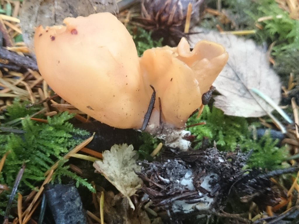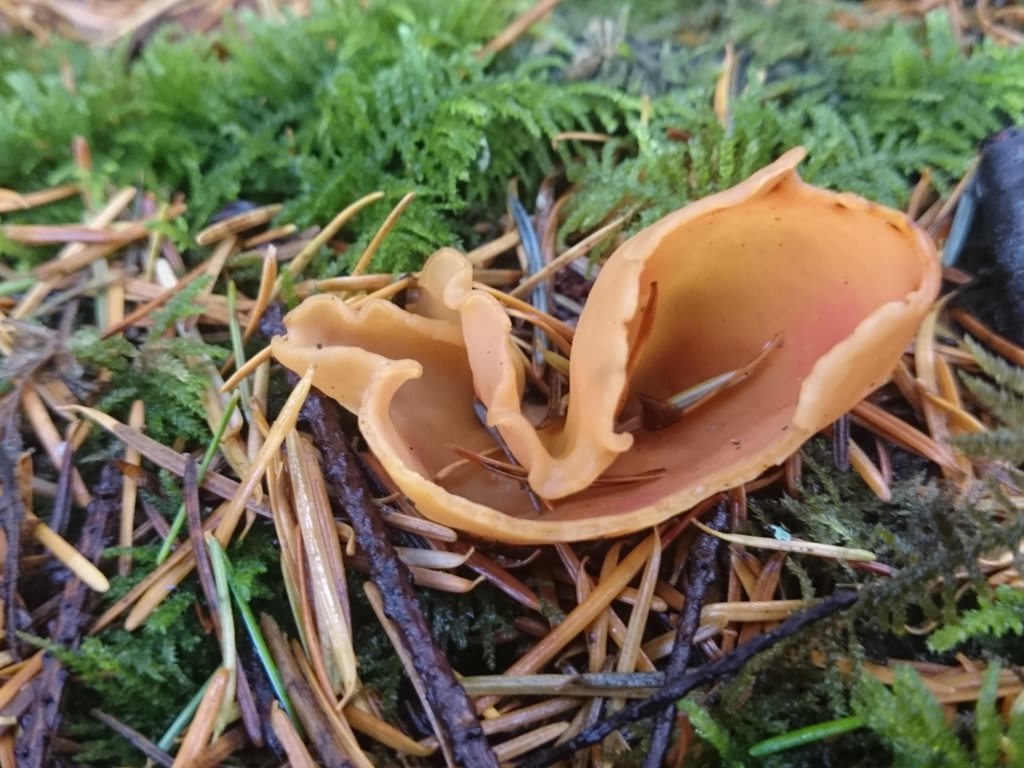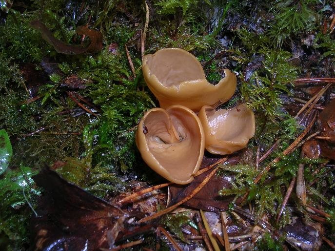 Fruktkroppen är sked-, öron- eller koppformad med ett tydligt kluvet snitt längs ena sidan. Den kan bli upp till cirka 10 cm hög och 6 cm bred. Insidan är gulaktig till orange och utgör den sporbildande ytan. Utsidan har en liknande färgton, ibland något blekare, och är jämn utan rosa prickar. Fruktkroppen sitter direkt på marken eller på förnan, utan tydlig fot. Köttet är svagt gulaktigt, tunt och sprött och bryts lätt vid hantering. Svampen har ingen tydlig lukt.