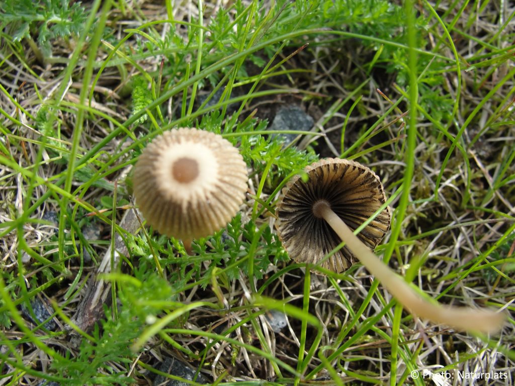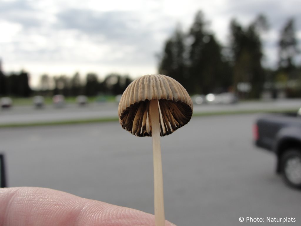 Hatten är 0,5–1,5 cm bred, först oval, blir sedan konvex eller klockformad, för att senare plattas ut och slutligen bli grunt konvex som ett litet parasoll. Färgen är gråaktig med en kanelfärgad mitt. Hattens yta är djupt radiärt räfflad och blir allt mer grånande från kanten in mot centrum med åldern. Skivorna är först rosa, blir därefter grå och slutligen svarta när sporerna mognar. Stammen är 3–7 cm lång och 0,1–0,2 cm tjock, mycket tunn, vit med brunaktig missfärgning från basen uppåt. Den är spröd och ihålig. Sporavtrycket är svart. Svampen saknar tydlig lukt och har inget matsvampsvärde.
