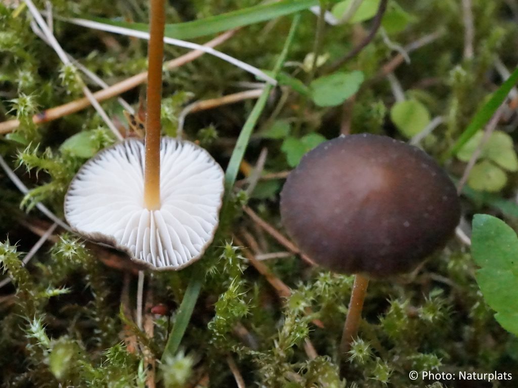 Hatten är 1–3 cm i diameter, först konisk eller konvex men blir med tiden mer utbredd och nästan platt. Färgen är matt brun och ytan slät. Köttet i hatten är vitt, tunt och skört. Skivorna är vitaktigt gråa, täta och urnupna mot stammen. Stammen är 2–7 cm hög och 0,1–0,2 cm tjock, smal och något avsmalnande uppåt. Färgen är lik hattens eller något blekare. Stammen är ihålig, skör och utan ring. Köttet i stammen är vitt och mycket sprött.