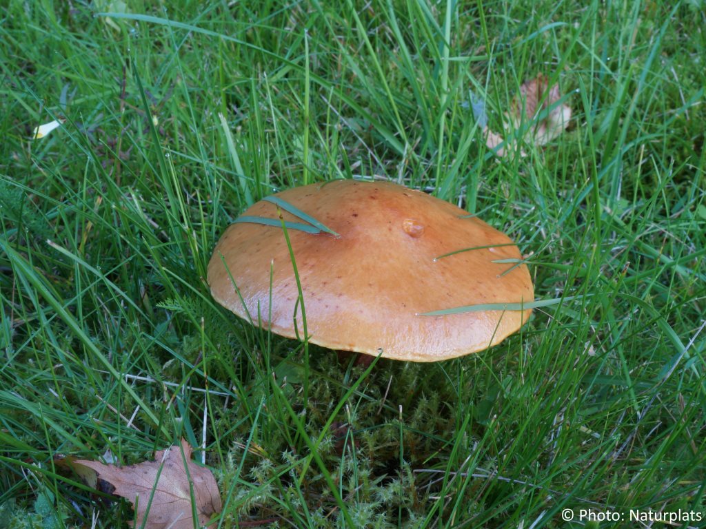 Hatten är 4–10 cm bred, guldgul till rödgul i färgen. Den är först välvd med en svag men tydlig puckel i mitten, och breder sedan ut sig något med åldern. I torr väderlek är hatten glänsande, men i fuktigt väder blir hattytan tydligt slemmig. Rören är klargula som unga och blir senare mer smutsgula. Rörmynningarna är små och runda och är hos unga svampar täckta av ett gulvitt hylle (slöja). Vid tryck kan porerna färgas lilabruna. Stammen är relativt lång och smal, seg och smutsgul till färgen. Den har en liten smutsgul ring under hatten, rester av den partiella slöjan.