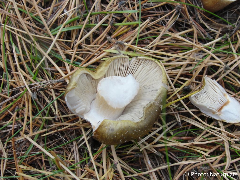 Hatten är 5–12 cm bred, först tydligt konvex men plattas ut med åldern och får då ofta en bred, svagt upphöjd topp. Färgen är blekt gulaktig till grönaktig med fina brunaktiga fibriller som strålar radiärt ut från mitten. Hattytan kan vara något klibbig i fuktigt väder. Köttet är benvitt och svagt gultonat precis under hatthuden. Skivorna är vitaktigt ockrafärgade, mycket breda och tättsittande (trånga), och sitter vanligen svagt urnupna till nästan vidväxta mot stammen. Foten är 5–10 cm hög och 1–3 cm tjock, kraftig och ofta något vidgad vid basen. Färgen är ljust gulaktig till svagt grön- eller gråtonad, ibland med svaga längsfibrer.