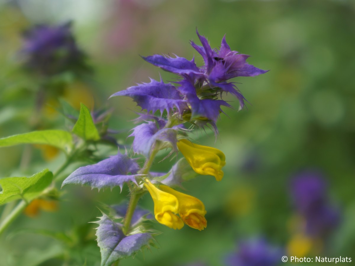 Det mest iögonfallande är de färgade högbladen nära toppen: de är ofta blåvioletta till purpurfärgade och sitter som “kransar” runt blomställningen. Själva blommorna är gula och tvåläppiga och sitter mellan högbladen, vilket ger den tydliga färgkontrasten som gjort arten känd. Natt och dag blommar under sommaren och lockar många pollinerande insekter.