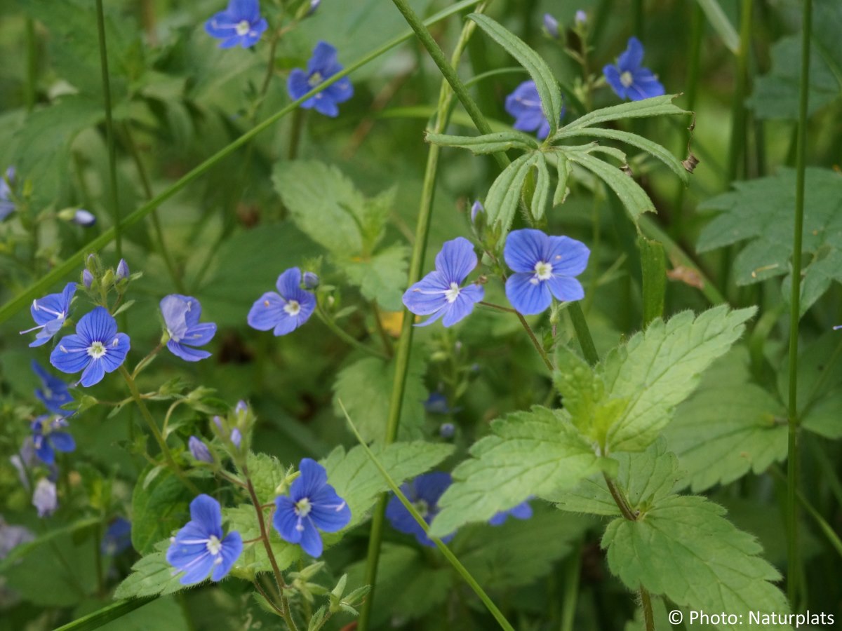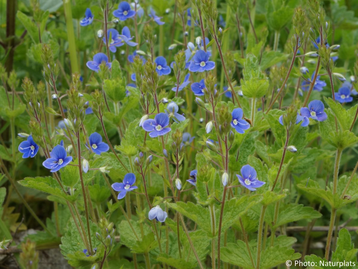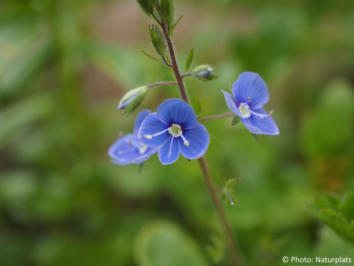 Bladen sitter motsatta, är äggrunda med grov sågtandning och växten har ofta en tydlig hårkant längs stjälken. Den blommar från vår till sommar med klara, himmelsblå blommor med vit mitt och mörkare blå ådring. Blommorna är relativt små men mycket iögonfallande och sitter på korta skaft i bladvecken.