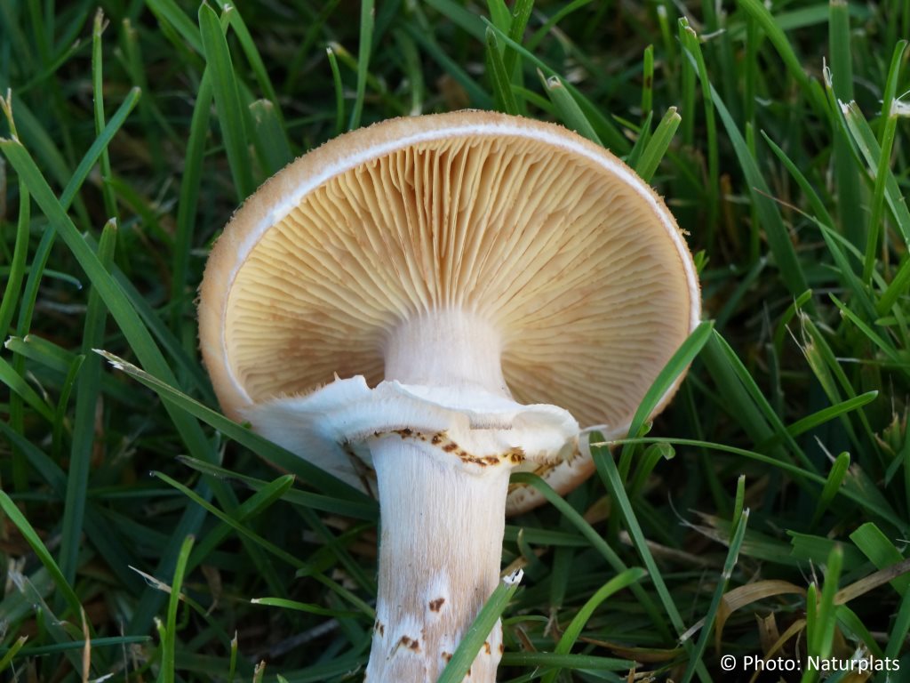 Hatten är variabelt ockrafärgad till mörkbrun, oftast ljusare mot kanten och mörkare i centrum. Hattytan är täckt av mörkare fjäll som blir tätare mot mitten. Formen är först konvex, men blir senare mer tillplattad och kan bli något vågig med åldern. Köttet är vitt, tunt och fast. Skivorna är först vita, blir sedan gulaktiga och till sist mer brunaktiga, ofta med mörkare fläckar hos äldre exemplar. De är täta, ganska breda och något oregelbundna. Stammen är först vitaktig men blir senare gulaktig till rödbrun, ibland något avsmalnande mot basen. Den är inte ihålig och har glesa, mörka fjäll, särskilt på den övre delen. Ringen är gulaktig, bomullslik eller ullig och sitter fäst runt stammen en bit under hatten.