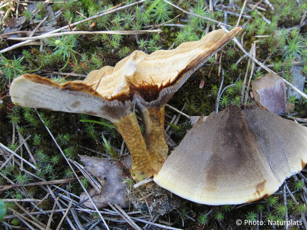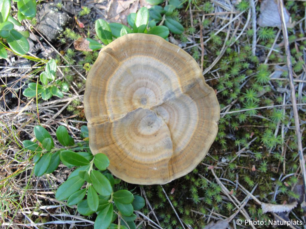 Hatten är tunn och läderartad, 2–8 cm i diameter. Ovansidan har tydliga koncentriska mönster i olika nyanser av ockra, grått och rostbrunt, vilket ger svampen ett bandat och zonerat utseende. Hattkanten kan vara något inrullad hos unga exemplar och bli mer vågig med tiden. Porlagret på undersidan är mörkbrunt med små porer. Köttet är brunt, tunt och blir hårt och segt när svampen torkar. Foten är smal, brun och 2–8 cm hög, seg och djupt förankrad i marken, oftast mer eller mindre centralt placerad.