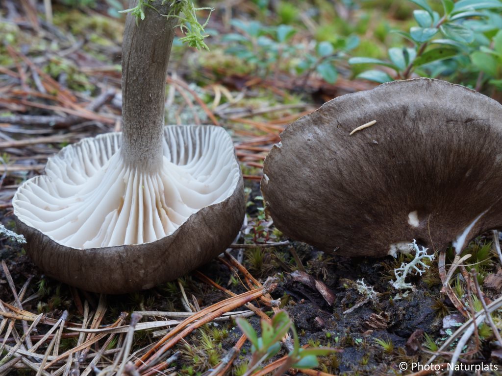 Hatten är 6-12 cm i diameter, brunsvart till svart och har mörka radiära strimmor. Den har ofta en puckel på mitten. Skivorna nedlöpande, glesa, vaxartade, som unga vita, med åldern vitgrå. Stammen är något ljusare än hatten, upptill ofta ljusare, och 2-8 cm hög. Köttet är vitt, skört, med mild smak och behaglig doft.