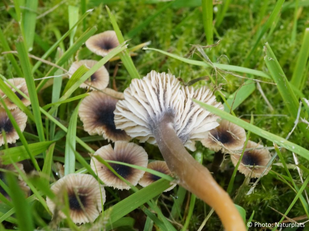 Hatten är 0.4-1.2 cm bred, konvex, expanderar till nästan plan, ibland centralt insjunken. Kanten är nedböjd, ibland vågig; inte klibbig, mörkbrun i mitten av hatten, blek-brun mot kanten. Skivorna går ned på stammen, ganska väl fördelade, först vitaktiga, sedan gräddfärgade. Stammen 1,5-4,0 cm lång och ca 1 mm tjock, rund, blir tjockare mot toppen. Färgen är mörkt violettbrun till blåsvart vid toppen, blek brun-orange under. Svampens lukt och smak mild.