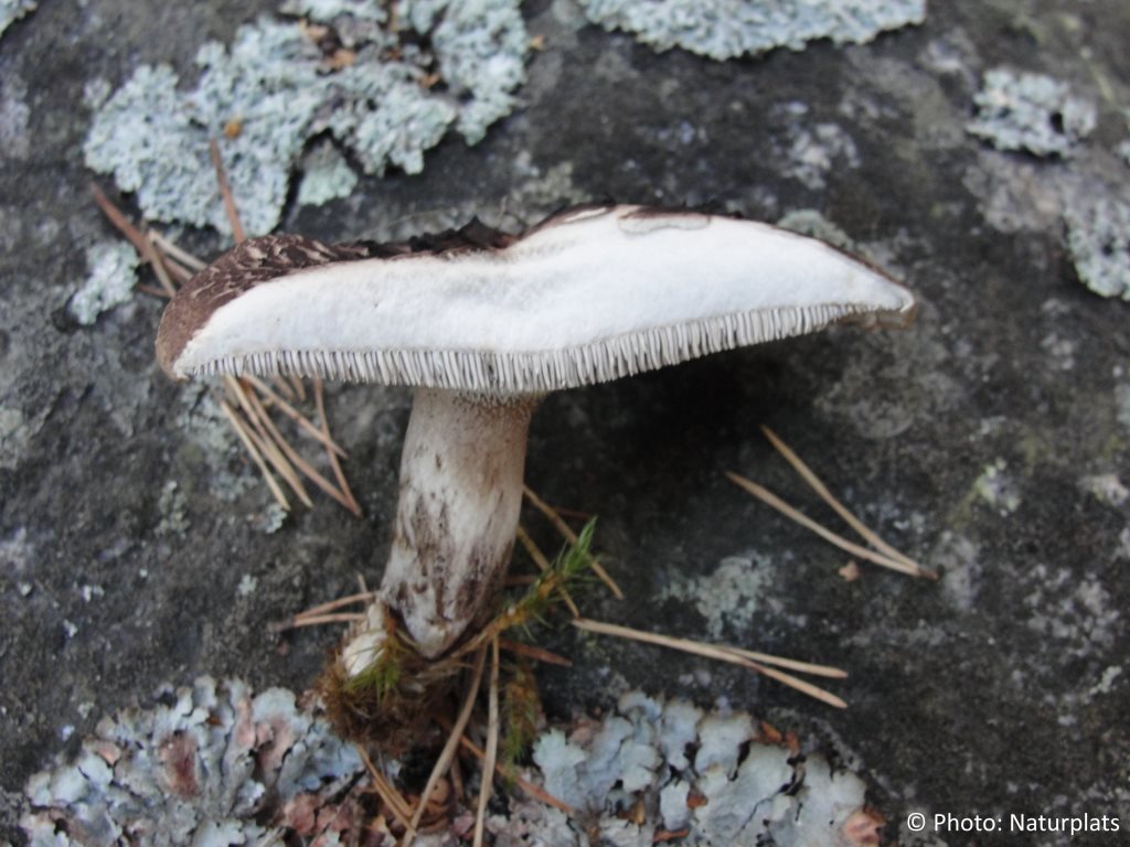 Förväxlingssvampar: Motaggsvampen är något ljusare i köttet än den snarlika fjälliga taggsvampen som växer med gran.