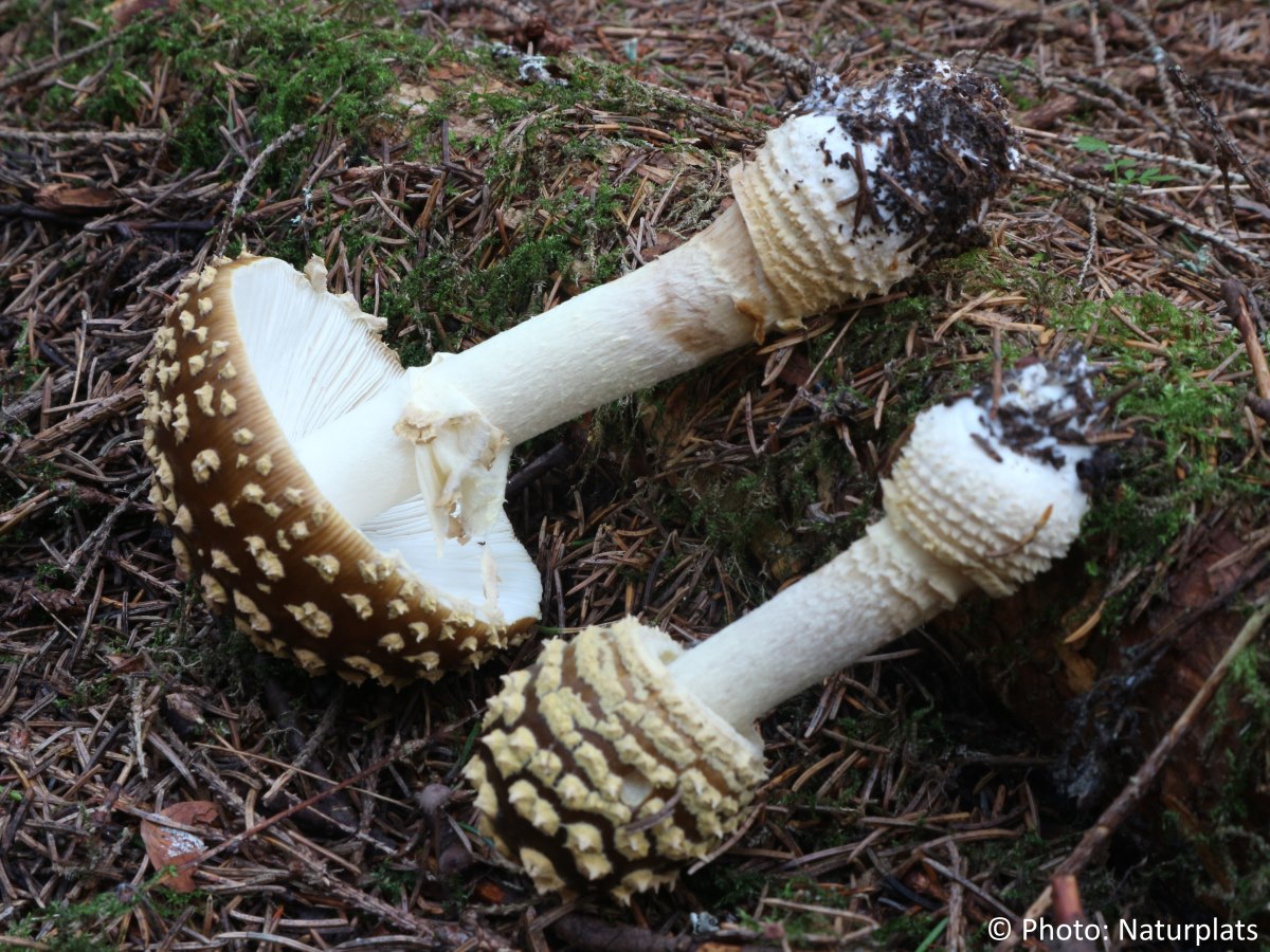 Hatten är 10–20 cm i diameter, brun och vanligen prydd med gråvita, vårtlika fläckar som är rester av hyllet. Formen är först välvd men blir senare mer utbredd. Hattytan kan vara något klibbig i fuktigt väder. Skivorna är täta, fria från stammen och vita med en svagt gräddfärgad ton. Stammen är vit och relativt slät, med en kraftig vitgul ring en bit nedanför hattranden. Vid den löklikt uppsvällda fotbasen finns gråvita fjällkransar (hyllerester).