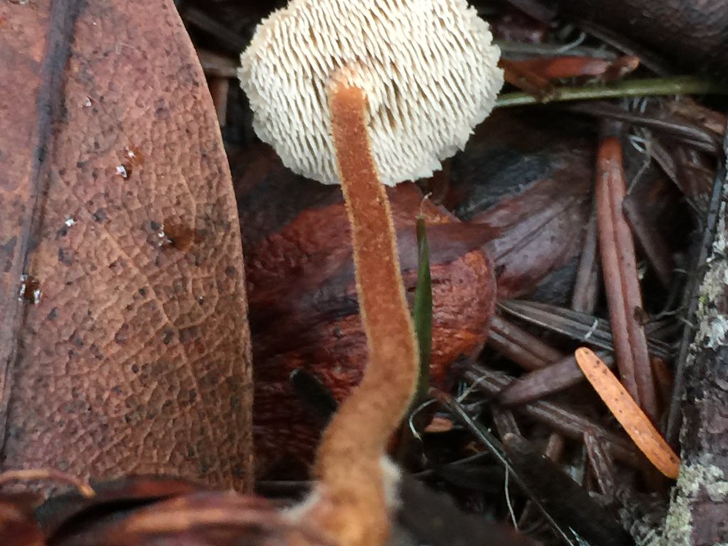 Hatten är 1–4 cm bred, konvex till platt och kan vara njurformad eller nästan cirkulär. Hattytan är tydligt hårig och mörkt brun till nästan svart, ibland något ljusare mot kanten. Undersidan har täta taggar, cirka 1–3 mm långa, som är vita i början men blir mer brunaktiga med tiden. Taggarna sitter tätt och täcker hela hattens undersida, ofta något nedlöpande mot stammen. Stammen är 2–10 cm lång och upp till cirka 3 mm tjock, vanligen sidoställd i förhållande till hatten. Den är mörkbrun, hårig och kan vara något böjd eller krokig eftersom den anpassar sig efter underlaget (ofta en kotte). Köttet är vitt till svagt brunaktigt, segt och tunt, utan särskilt framträdande lukt eller smak.