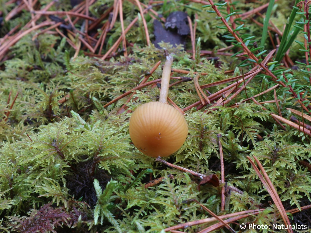 Hatten är liten, först konisk till klockformad, senare mer välvd, ofta med en liten puckel. Färgen är gulbrun till rostbrun, vanligen ljusare mot kanten. Hattkanten är tydligt strimmig nästan in mot mitten, särskilt i fuktigt tillstånd, och hos unga exemplar kan små vita slöjrester ibland synas längs kanten. Skivorna är ganska glest sittande och först blekgula, men blir efter hand gulbruna till rostbruna när sporerna mognar. Köttet är tunt och oansenligt, utan särskilt utmärkande lukt eller smak. Stammen är mycket smal, ihålig och gulbrun till brunaktig. Den är ofta något sträv upptill genom fina slöjrester och saknar ring.