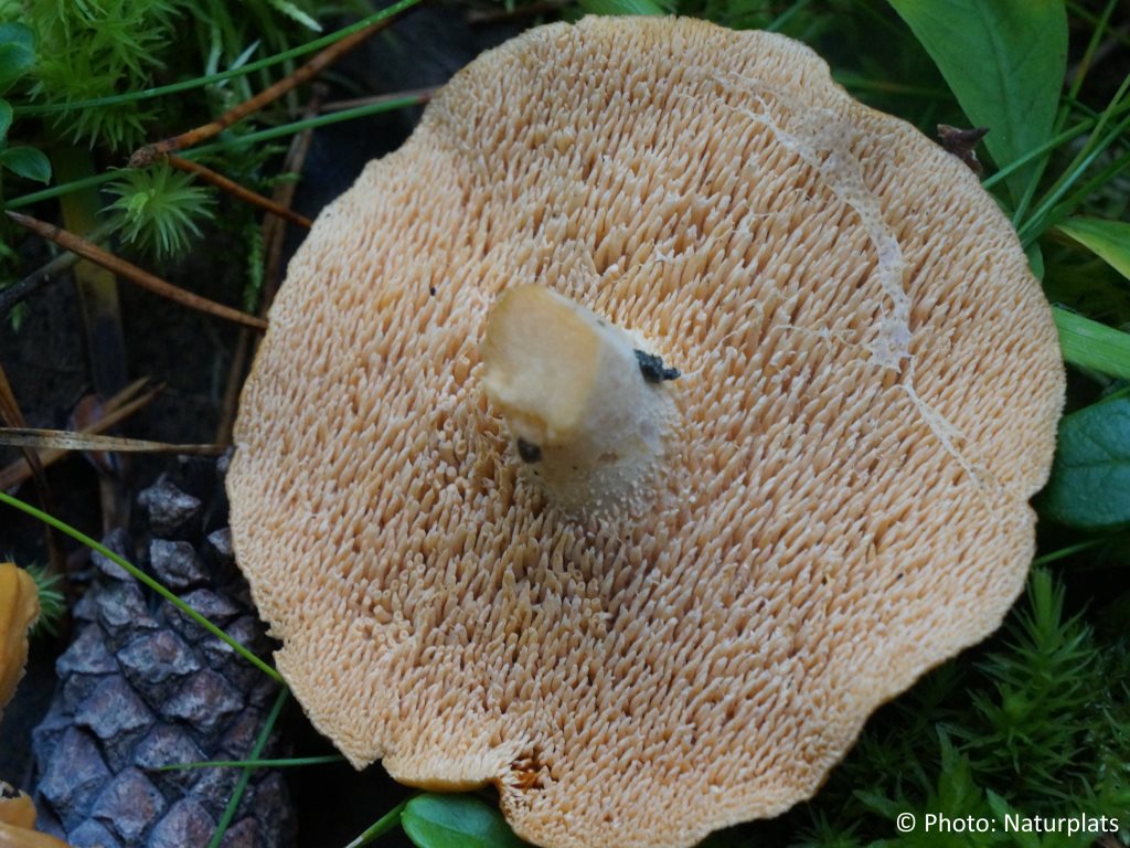 Hatten är 2-6 cm bred, oregelbunden och orange-brun till färgen. Den har täta och korta taggar på undersidan av hatten i stället för skivor. Stammen är blekt gräddgul med inslag av orange. Sporerna är vita. Köttet är grädd-orange färgat.