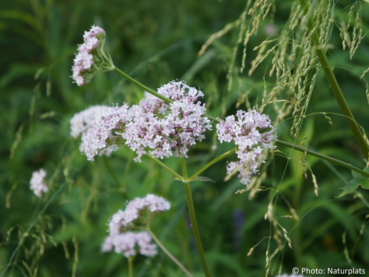 Bladen är motsatta och parflikiga med flera smala småblad, vilket ger plantan ett “fjäderlikt” bladverk. Den blommar under sommaren med många små, ljust rosa till vitrosa blommor samlade i stora, välvda klasar som kan se ut som mjuka “blomskyar” på håll. Blommorna doftar ofta sött, medan roten har en stark, speciell doft.